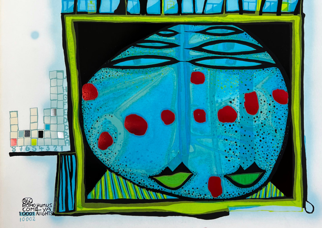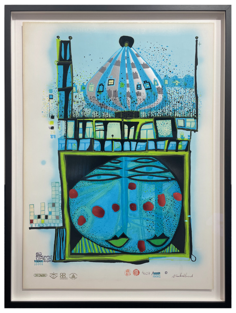 Hundertwasser hat den Datumstempel gesetzt und in selbstgemachter Tusche signiert, in Tusche, die er aus flüssigem Ruß gewonnen hat, das aus seinem Ofenrohr tropft. Er hat die Gummistempel 10002 über die Zahlen 10001 gesetzt und die japanischen Stempel mit dem japanischen Stempelkissen (Inkan) angebracht.