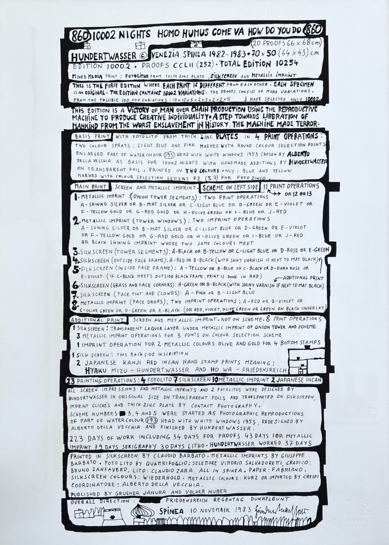 Das war eine Anstrengung, die schwer nachvollziehbar ist: zehntausend Originale innerhalb einer Edition. Das Signieren allein dauerte achtzehn Tage, innerhalb von zwei Monaten. (aus: Hundertwasser 1928-2000, Catalogue Raisonné, Bd. 2, Taschen, Köln 2002, S. 867)
