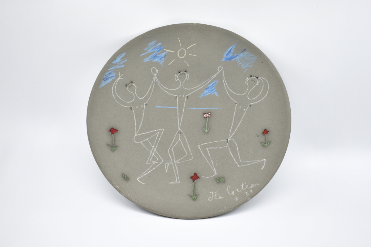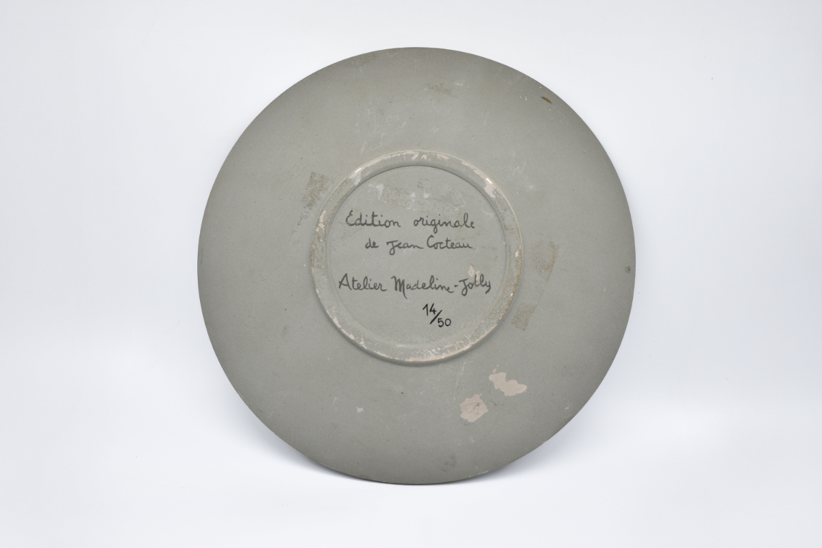 round plate described as No. 217 in Annie Guédras „Jean Cocteau Céramiques“, Paris 1989 provenence: Geneviève Albrechtskirchinger, Königsstein im Taunus No. 14 from an edition of 50 exemplar |